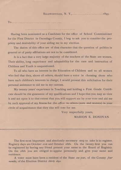 Marion E. Donovan campaigned for School Commissioner for the First District in Onondaga County, New York in 1893 on the Democratic ticket. In her campaign Donovan appealed to the support of women in particular: "to all women who feel that …