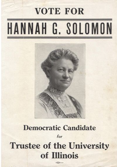 In 1904 Hannah G. Solomon campaigned as a candidate of the Democratic party for the position of University of Illinois Trustee. She did not win, receiving 341,389 votes (10.64%). In 1916 the Democratic party again nominated her for this of…